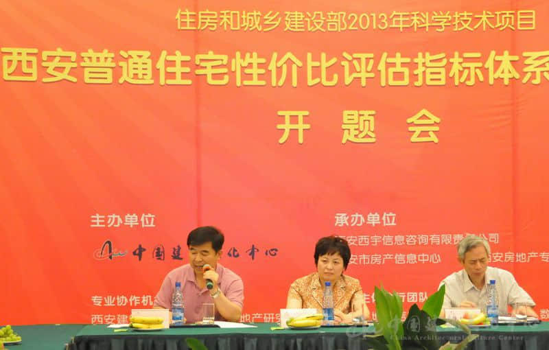 2013年7月7日,住房城乡建设部2013年科学技术项目“西安普通住宅性价比评估指标体系应用研究”课题在西安举开题会。住房和城乡建设部政策研究中心主任秦虹、中国房地产业协会副会长朱中一、中国房地产及住宅研究会副会长顾云昌、住房和城乡建设部房地产市场监管司处长李晓龙、西安市房产信息中心主任李朝东、陕西省房地产研究会会长王圣学、陕西省建筑设计研究院总建筑师顾宝和、西安建筑科技大学副校长刘晓君、西安交通大学校园发展规划部副主任兼总规划师许楗、中国建筑文化中心领导宁玉明、中国建筑文化中心课题研究项目总负责人符忠源、中国建筑文化中心文化交流部主任王丽、王刚等领导、专家、学者及部分课题组成员30余人参加了开题会。 专家学者们对课题的选题给予了充分肯定,并对课题研究过程中应注意的问题提出了建议。