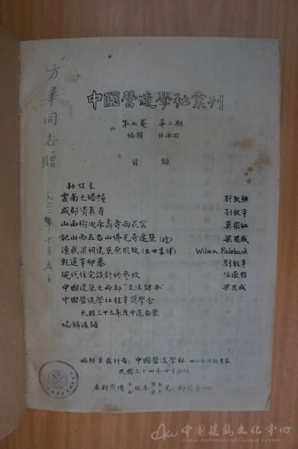 值得一提的是馆内收藏的第七卷第二期,这本特殊的石印刊物,是梁思成、林徽因等学社同仁们于四川南溪县李庄自行绘图、编印、装订成册、出版发行的两期汇刊之一。抗战时期,由于当地纸张缺乏,他们只能使用土纸,将墨线图画在药纸上,稿子抄写在药纸上,再拿去石印,从折页子、跺齐、订孔、穿纸到裱装封面都是自己动手完成,第七卷一、二期共石印了200册。这两期营造学社汇刊,凝聚了学社同仁们的聪明才智和辛劳血汗,其中还包括林徽因先生的母亲等学社家属们的参与功劳。
