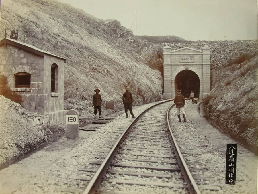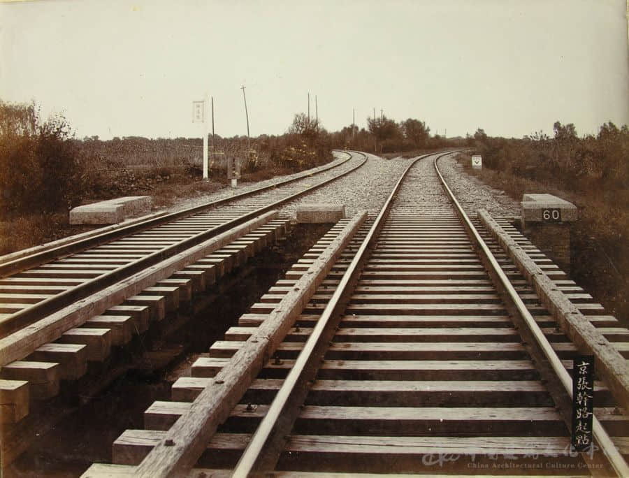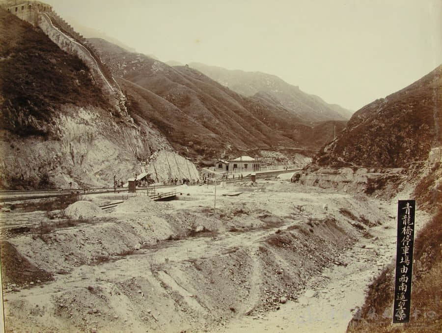 将“青龙桥停车场由西南遥望景”(见图11)这张照片进行放大后,人们更可以看出很多值得探究的细节——照片正中位置,工人们正在搭梯修筑铁路护坡,每个工人的动作都被十分清楚地记录下来,据此可以推断出当时采用的工艺方法,而这座铁路护坡至今仍屹立在古老的长城脚下。在照片右侧,可以看到用“苏州码子”书写的桥梁标,上面标记“〣〩”,表示该桥为第39号桥,具有鲜明的时代特点,时至今日这座桥也依然在用,桥栏杆与这张照片中的完全一致;而进站位置的立杆,应该是当时京张铁路广泛使用的信号设备,在其他照片中也有体现。