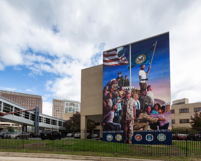 除了艺术培训,项目还在帮助这一人群发掘工作潜力,提供基础生活的帮助。此项目每天请80-100名参与过培训的人抽奖券,中选者将帮助设计和绘制壁画。该项28周内,有451人参与了项目,发出金额超过77950美元。这个项目在2020年获得美国住房和城市发展部给与的“公共慈善伙伴关系奖”,以表彰本项目及支持者谢勒家族基金会与政府之间的创新伙伴关系,肯定了项目对于改善全国低收入居民生活质量的成果。疫情期间,廊灯项目与民族服务中心联合展了制作口罩的活动,召集费城东南地区妇女为社区制作3000个口罩,采取买一赠一的方式,鼓励大家为这一项目捐赠,其中一半的费用将给与社区制作人员。这一项目还包含退伍军人服务板块。时代的更迭、战争的创伤、现实生活的窘迫等情况一直存在,美国的退伍军人需要被关注。詹姆斯•伯恩(james burns)的壁画作品为退伍军人引来了关注,壁画给予退伍军人一个讲述自己的机会,也令市民能够更深入地了解历史。(图12)