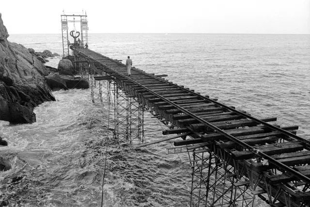 奇利达和他的合作伙伴建筑师甘切吉原本的打算是从位于萨拉戈萨(Zaragoza)的美军基地调一架“奇努克”(Chinook)直升机进行吊装,但是没有那个吨位的大型直升机,根本无法长时间悬停在一处地方静止不动,雕塑也无法快速精准调校角度进行安装,这个方案被否决。另一个方案是从伊格尔多山上建一个钢架,将雕塑从山顶吊装下来,但是无法精准解决放置位置和角度问题。此外又考虑了使用木筏或者浮吊设备,但是该地区水浅而礁石多,风大浪急,船只根本无法靠近。最后,他们不得不采用最原始的方式,用钢管搭建脚手架的方式,从广场通往安放雕塑的礁石之间建造了一座临时的桥,并且在桥上铺设了轨道,架设了起重机。虽然徒增了巨大的工作量,但最终总算平稳地安装完这三个巨大的钢铁“梳子”。在临时桥梁和所有的安装设备拆除后,海岸上恢复如初,只留下雕塑仿佛从岩石中自然生长出来(图13)。