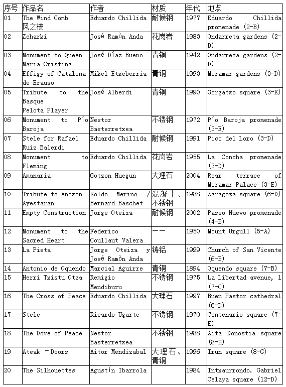 作为露天雕塑博物馆,圣˙塞巴斯蒂安城市旅游局官方宣传的著名雕塑共有50座,在此例举了其中20件主要城市雕塑(见表1)。