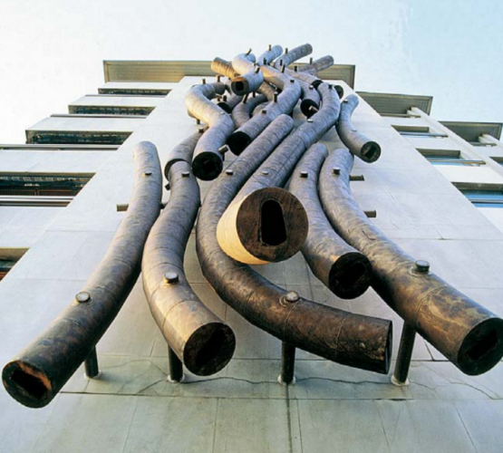 尽管在大多数情况下,公共雕塑放置在街道、草地、广场上,但是由雕塑家雷米吉奥˙门迪布鲁(Remigio Mendiburu,1931-1990)设计的这件作品却依附在建筑物的外墙。这件名为《Herri Txistu Otza》的作品,是由十二个长度为12-15米的以上空心不锈钢管锻造焊接而成,缠绕蜿蜒曲折,仿佛它们是扭曲的树干或巨大的树根。(图15)在门迪布鲁的手中,冷冰冰的钢铁材质被雕塑家激活了生命,犹如木头一般,工业感和自然性在此得到了完美的融合。