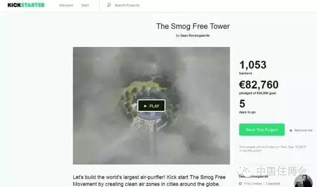 ▼团队已经做好空气净化塔的模型,但是还需要资金将模型变为实体。在今年的九月七号Dann在国外众筹网(kickstart)上发起了“共建空气净化塔”项目,目标是筹集5万欧元建造第一个空气净化塔。