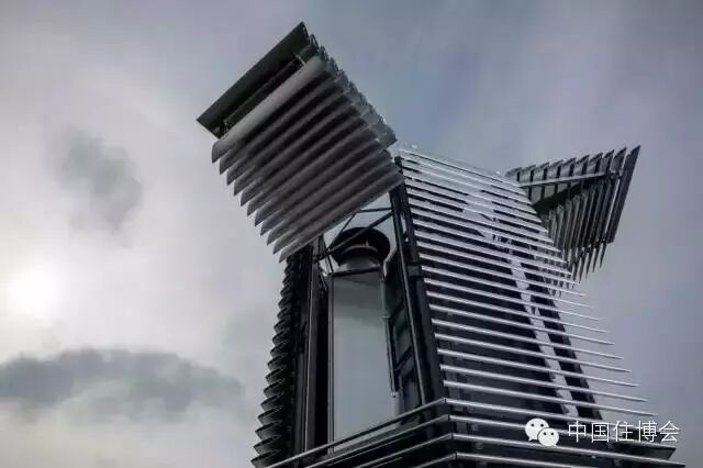 ▼外观是白色百叶窗结构的空气净化塔,可以吸入被污染的空气,经过净化后再将干净的空气排出。