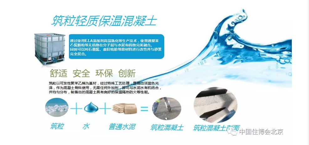 筑粒以可发性聚苯乙烯为基材,经过特殊工艺处理,显现出淡蓝色光泽,作为混凝土骨料使用,无需任何外加剂,即可与水泥水有机结合,并均匀分布,制备出的混凝土具有良好的保温隔热防火等性能。
