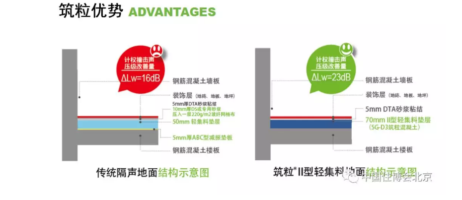 地面应用示意图,筑粒混凝土具有超轻质特级隔声等等性能优越。