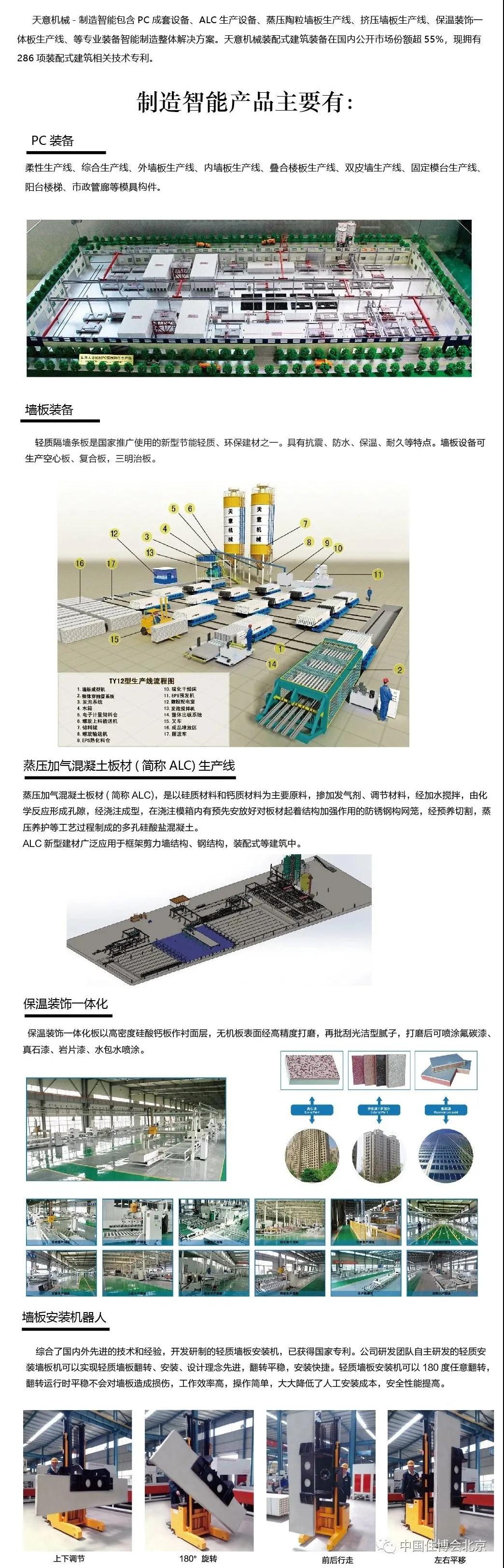山东天意机械股份有限公司创建于1998年,是集装配式建筑装备研发设计、装备制造、运营服务为一体的服务型制造企业。公司重视技术创新,积极推动产业进步,共取得技术专利286项,起草、参编17项国家及行业标准。2012年8月,创建PC设备生产工厂,为客户提供售前规划咨询构件设计、构件生产安装培训等PC成套设备整体解决方案。公司专注打造装配式建筑产业园,主导系列产品有PC装备、轻质墙板装备、蒸压加气混凝土(ALC)生产线、保温装饰一体化板生产线等,部分产品国内市场占有率达40%以上,并出口印度、沙特阿拉伯、南非、哈萨克斯坦等106个国家和地区,已累计销售256条PC生产线、6000余条墙板生产线、18个综合产业园项目。2018年5月,与德国ISOCOM公司合资成立山东特博特建筑科技有限公司。同年6月,收购德国具有36年历史的装配式建筑装备技术企业—BCDS公司,并在德国建立了研发中心。运用德国工业4.0技术,使天意机械装备智能化达到国际水平。