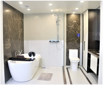 柯依迪装配化装修系统样板房基于SI体系的分离法建造,涉及装配式整体卫生间(一体式卫生间底座及整体墙面安装);装配式地暖地面系统(地砖石材、木地板、地暖系统干法施工);装配式墙面系统(墙面集成竹木纤维、艺术钢板、木饰面组装);收纳系统(工厂定制化收纳柜体)等。