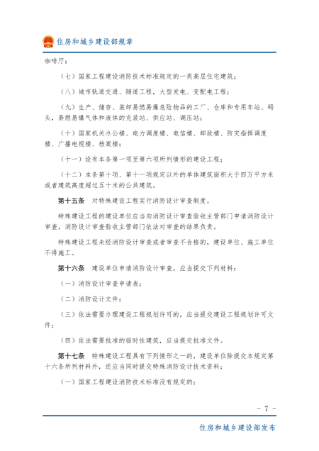 一、将第十七条修改为:“特殊建设工程具有下列情形之一的,建设单位除提交本规定第十六条所列材料外,还应当同时提交特殊消防设计技术资料: