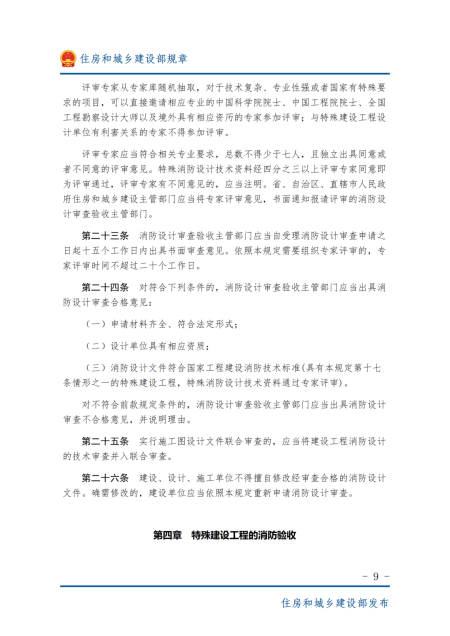 三、将第二十一条改为第二十二条,第三款修改为:“评审专家应当符合相关专业要求,总数不得少于七人,且独立出具同意或者不同意的评审意见。特殊消防设计技术资料经四分之三以上评审专家同意即为评审通过,评审专家有不同意见的,应当注明。省、自治区、直辖市人民政府住房和城乡建设主管部门应当将专家评审意见,书面通知报请评审的消防设计审查验收主管部门。”