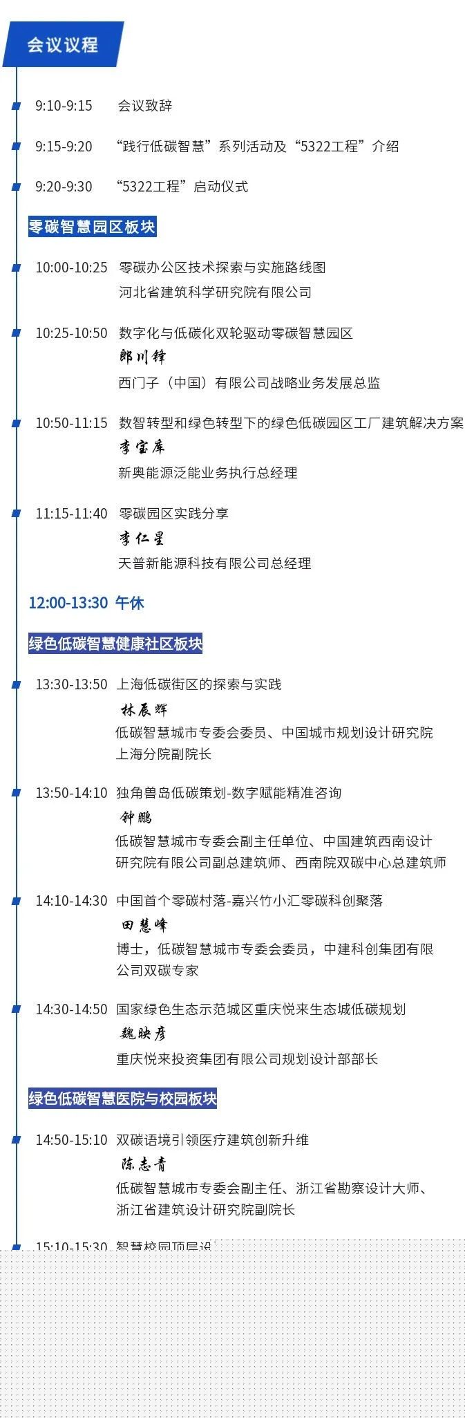 | 13:50-14:10 | 独角兽岛低碳策划-数字赋能精准咨询 | 钟 鹏 | 低碳智慧城市专委会副主任单位、中国建筑西南设计研究院有限公司副总建筑师、西南院双碳中心总建筑师 | |