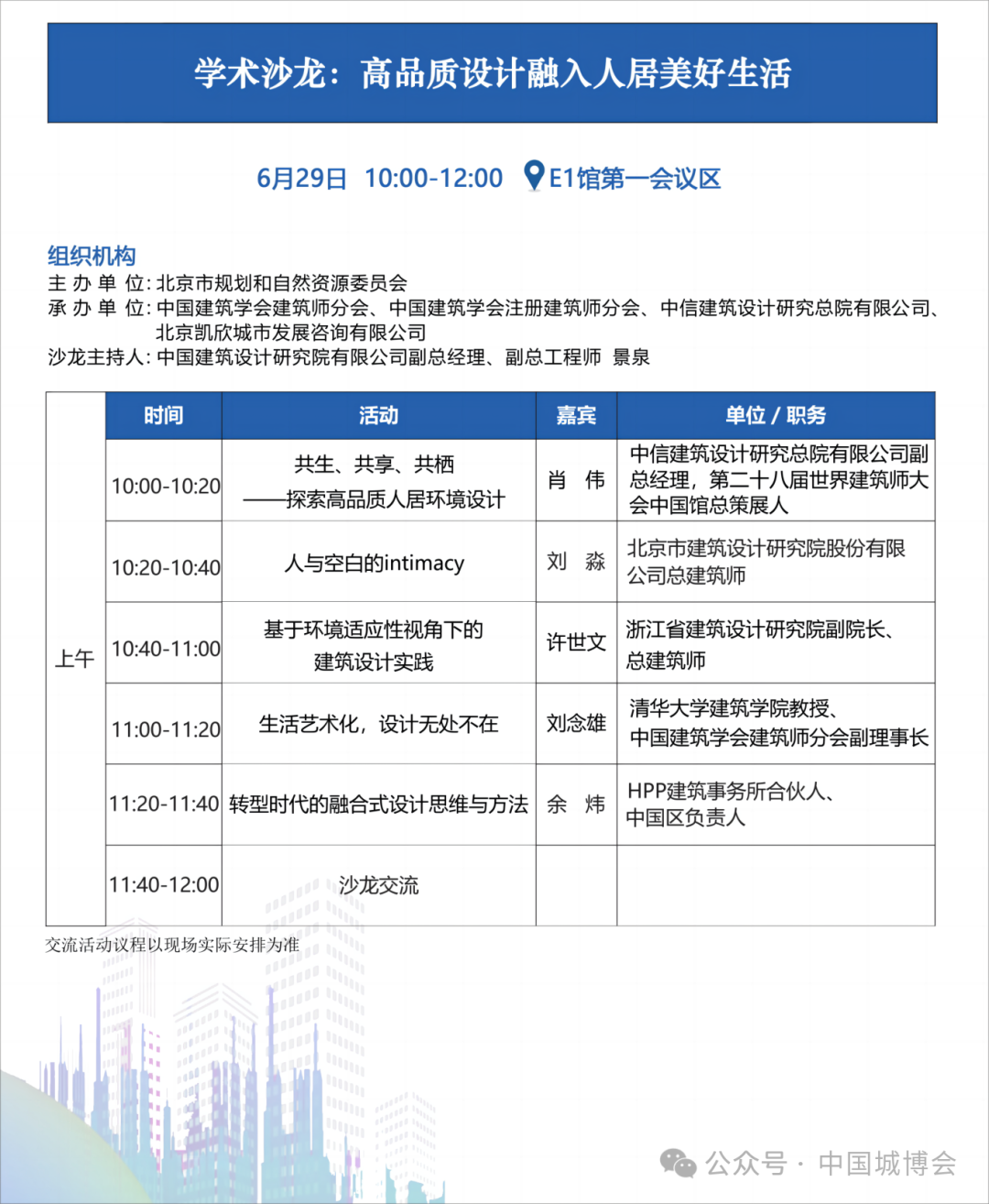 高品质设计融入人居美好生活学术沙龙 | 6月29日上午 | E1馆第一会议区 |
