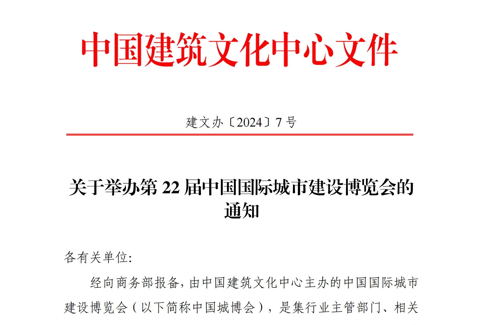 关于举办第22届中国国际城市建设博览会的通知 各有关单位: 经向商务部报备,由中国建筑文化中心主办的中国国际城市建设博览会(以下简称中国城博会),是集行业主管部门、相关学协会、权威媒体之力,展示城市建设成就、发展方向的行业盛会,是各级城市人民政府、行业主管部门、相关企业宣传、展示、交流、合作的重要平台,也是住房城乡建设系统试点工作的宣传